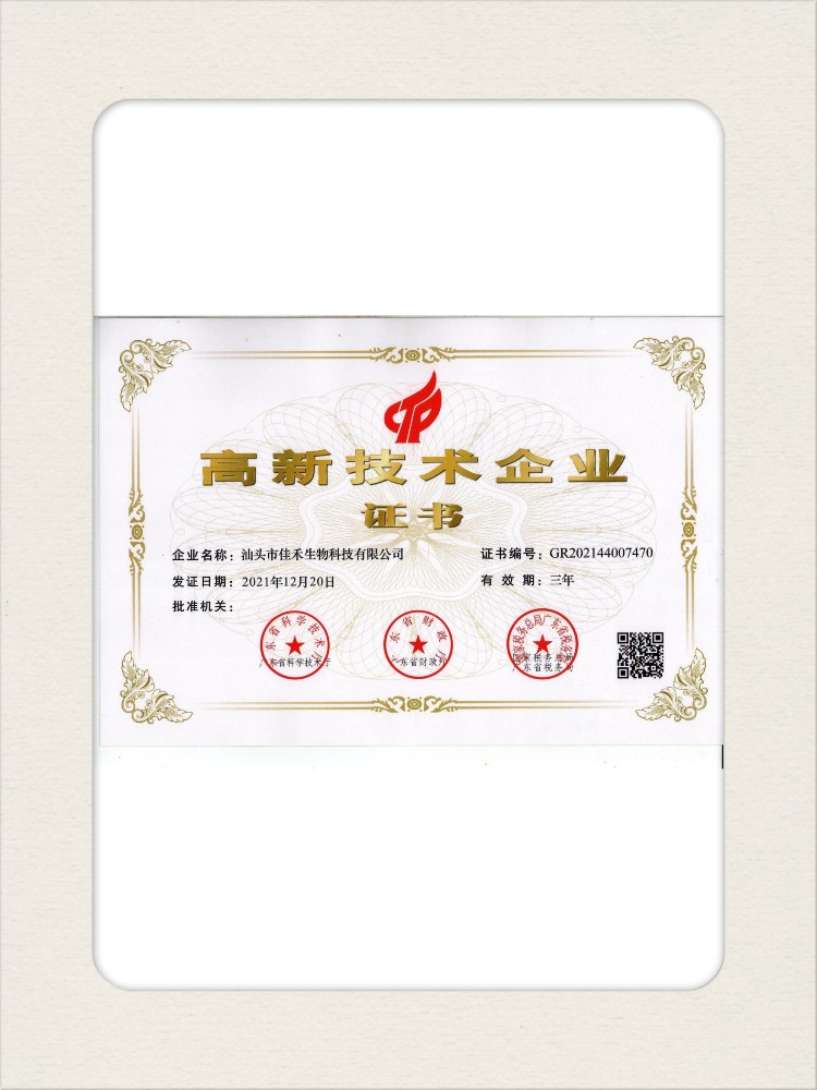 汕頭佳禾生物科技有限公司是一家致力于氨基酸及其衍生物研發(fā)、生產(chǎn)和銷售的國家高新技術(shù)企業(yè),先后通過了國家藥品GMP認(rèn)證,ISO9001質(zhì)量體系認(rèn)證、ISO14001環(huán)境管理體系認(rèn)證。目前,公司擁有“廣東省專精特新中小企業(yè)”、“廣東省氨基酸產(chǎn)品工程技術(shù)研究中心”、“汕頭市生物發(fā)酵工程技術(shù)研究開發(fā)中心”、“汕頭市知識產(chǎn)權(quán)優(yōu)勢企業(yè)”、“多項國家發(fā)明專利”、“廣東省守合同重信用企業(yè)”等多項資質(zhì)和榮譽,旗下“佳禾牌”系列產(chǎn)品已成為原料藥行業(yè)知名品牌。 新泰市佳禾生物科技有限公司成立于2012年8月,注冊資金2億元,公司位于山東泰安新泰市新汶工業(yè)園區(qū),是國 家級高新技術(shù)企業(yè)、山東省“專精特新”企業(yè)、山東省制造業(yè)單項冠軍企業(yè)、泰安市科技型中小企業(yè)、泰安市農(nóng)業(yè)產(chǎn)業(yè)化龍頭企業(yè)、中國生物發(fā)酵產(chǎn)業(yè)協(xié)會理事單位。